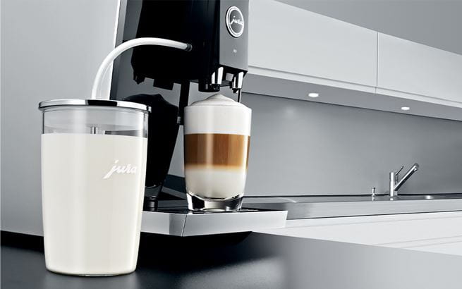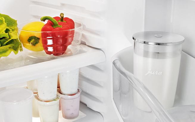 Melkebeholderen av glass er et fortreffelig tillegg til alle kaffeelskere som liker å skjemme bort familie og venner med en trendy flat white, latte macchiato eller cappuccino fra tid til annen. Den er helt i tråd med de typiske linjene til JURA design, er enkel å oppbevare i kjøleskapet og kobles til kaffemaskinen når det er ønskelig.  Melkelansen er koblet til slik at den har akkurat den rette høyden for at melken skal kunne trekkes inn og skummes enkelt. Beholderen rommer 0,5 liter og kan vaskes i oppvaskmaskinen.